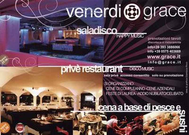 Discoteca ristorante Grace si trova proprio nel centro di Arezzo di fronte alla stazione centrale giorni di apertura Venerdi, periodo invernale da settembre a maggio.Il locale comprende due sale una discoteca l’altra privè restaurant nel quale si può ascoltare ottima musica live.Il genere musicale happyhouse nella sala grande per un pubblico medio adulto. Il prezzo del biglietto è di 20,00€ con consumazione ridotto 17,00€ la cena ingresso piu discoteca sono 45€, la cena comprende menù a base di pesce e sushi.